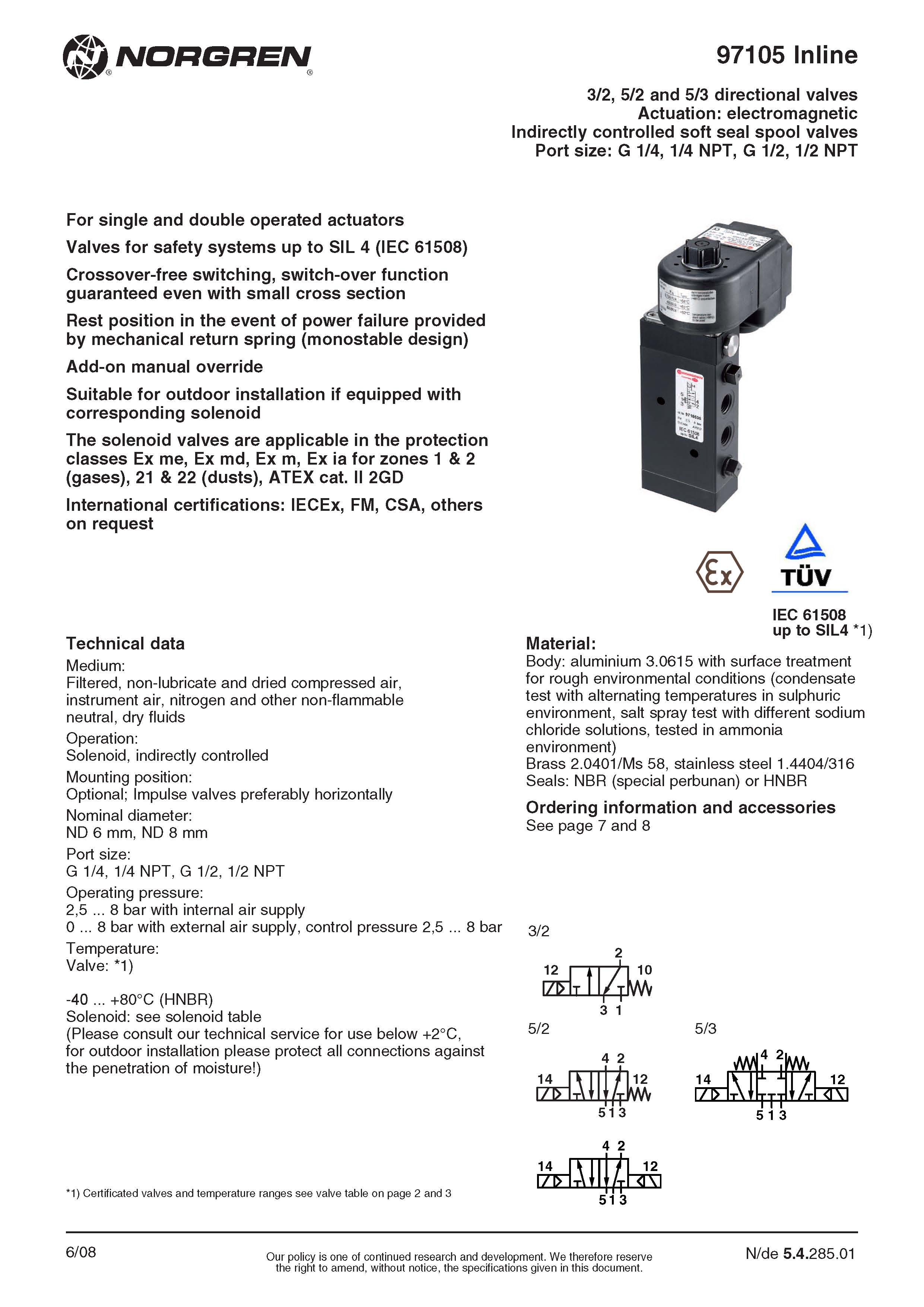 產(chǎn)品說(shuō)明:3/2,5/2&5/3先導(dǎo)電磁控制閥;G 1/4,1/4 NPT,G 1/2,1/2 NPT或NAMUR板接口。 自由交叉式切換,即便在很小的橫截面時(shí)也能保證切換功能。即便在電源故障時(shí)也能由機(jī)械返回式,彈簧提供安全保障(單穩(wěn)態(tài)樣式),附加手動(dòng)應(yīng)急控制。如果安裝了相應(yīng)的電磁線(xiàn)圈可適用于室外安裝;最小功率損耗,因此可以滿(mǎn)足很多防護(hù)等級(jí)的線(xiàn)圈,例如:EEx ;電磁閥可應(yīng)用于EEx me,EEx md,XP(1區(qū)),2(氣體),21,22(灰塵)ATEX類(lèi)別II2GD等保護(hù)等級(jí);通過(guò)了國(guó)際認(rèn)證:IEC Ex,F(xiàn)M,CSA.